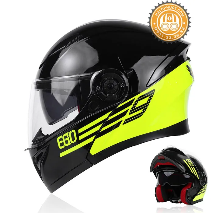 - Thương hiệu: EGO Helmet Khối lượng: 1.500 ± 50 gram Loại nón: Fullface lật hàm Kính: 2 kính Lót: có thể tháo rời Chất liệu vỏ: Nhựa ABS nguyên sinh Chất liệu mút xốp: EPS chịu lực Khóa: Micro lock Size: M (5355cm) L (5657cm) - XL (58-59cm) Kính chắn: kính ngoài màu trong suốt đi được ngày đêm, kính trong màu khói chống nắng Đạt tiêu chuẩn QCVN Bảo hành: 24 tháng lỗi kỹ thuật (trừ phụ kiện) Tặng kèm 1 túi đựng nón chính hãng + 1 thùng